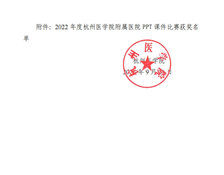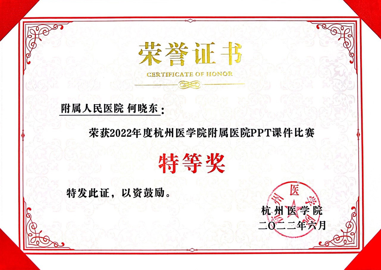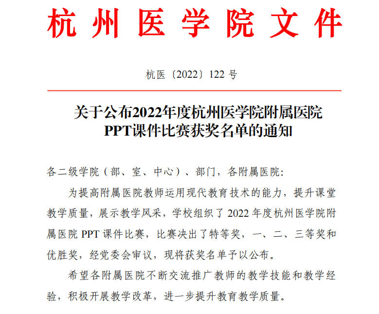 为提高附属医院教师运用现代教育技术的能力,提升课堂教学质量,展示教学风采,杭州医学院组织了 2022 年度杭州医学院附属医院 PPT 课件比赛,放射科教学秘书何晓东医师,以《中枢神经系统》课件参加本次比赛,力压群雄荣获特等奖,这也是近年来放射科高度重视教学工作和教学质量的成果体现。