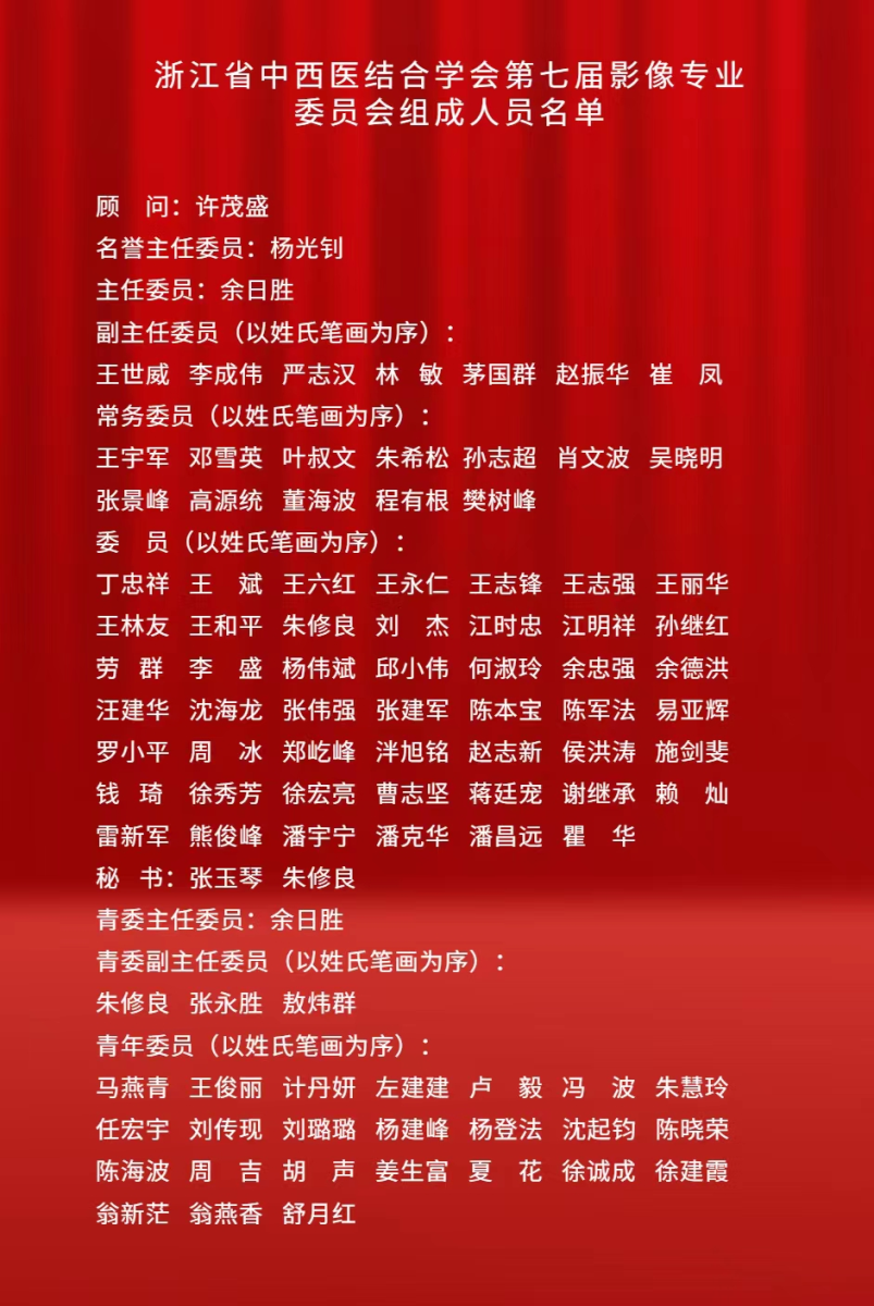2022年11月19日,浙江省中西医结合学会第七届影像专业委员会成立会议在杭州顺利召开,陈军法入选委员会委员、马燕青入选青年委员会委员。