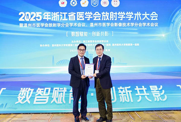 2025年浙江省医学会放射学分会学术年会7月10~12日在温州举行,我科超过20人赴温州参会,荣获大会颁发的“最佳组织单位奖”。龚向阳主任带去了最近编著出版的《磁共振系列丛书--脊柱脊髓分册》,分别赠送给2024~2025年度常委工作站---岱山县人民医院和苍南县人民医院。