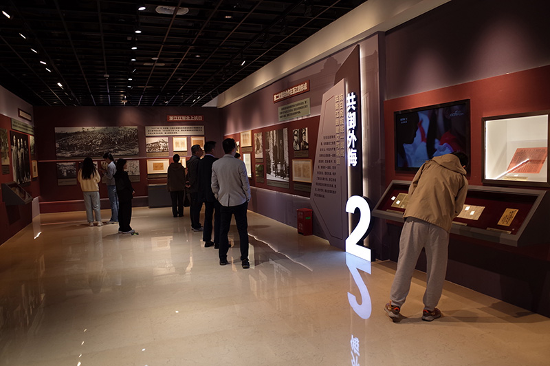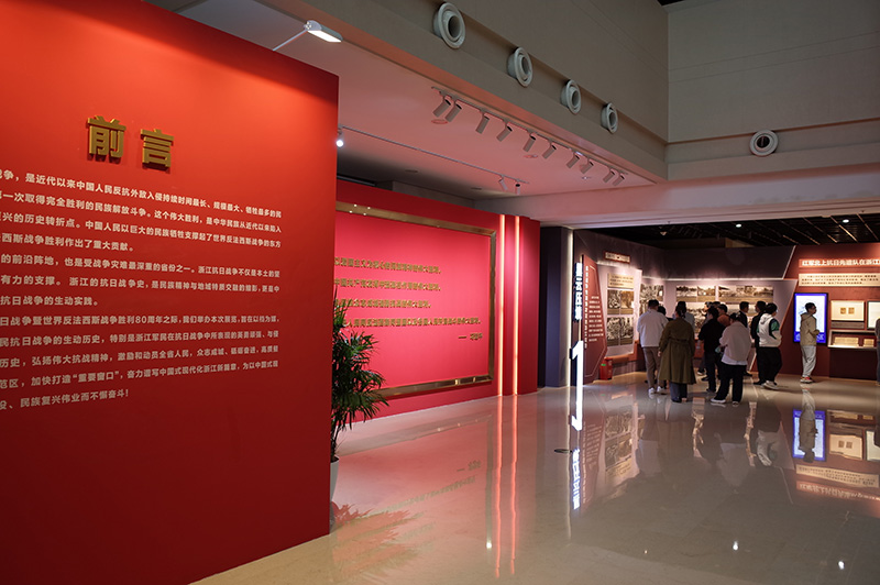 步入展厅,“1945-2025”抗战胜利80周年纪念标识与“铭记历史 开创未来” 的主题标语交相辉映,一尊展现抗日战士浴血奋战的雕塑瞬间将大家拉回那段硝烟弥漫的岁月。本次展览精选500余件珍贵档案文献,以“抗日战争全面爆发前的浙江局势”“中国共产党领导下的浙江敌后抗日”等七大篇章,全景式铺展浙江抗战的壮烈长卷。 在“浙江红军北上抗日”展区,党员们凝视着1937年红军集结出征的黑白照片与文献,耳畔仿佛回荡起慷慨激昂的《毕业歌》;驻足于“浙江军民对日反攻作战”板块,详实的档案资料与震撼的历史影像,生动还原了浙江军民在抗战后期同仇敌忾、奋勇反击的壮阔图景。当看到首次公开的日军“登陆跳板”实物时,木板上“鸿巢木材株式会社制”的日文字样,无声却有力地控诉着侵略的暴行,让大家深刻感受到和平的来之不易。 展厅中,杜立特行动中浙江军民救助美军飞行员的历史照片、“里斯本丸” 号事件里舟山渔民冒死营救英国战俘的档案,更展现了国际反法西斯阵营的深厚 友谊;而《告台湾同胞书》的泛黄手稿,字里行间满是台湾同胞渴望回归祖国、投身抗日的赤诚之心。在展览尾声的“伟大抗战精神”展区,“天下兴亡、匹夫有责的爱国情怀”、 “视死如归、宁死不屈的民族气节”、“不畏强暴、血战到底的英雄气概”、“百折不挠、坚忍不拔的必胜信念”,这四组铿锵有力的表述,与一旁永嘉县各界庆祝胜利日特刊的历史照片形成强烈呼应,让党员们对伟大抗战精神有了更具象的认知。看到结语中“让伟大抗战精神在之江大地永续传承”的号召时,大家的使命 感愈发强烈。